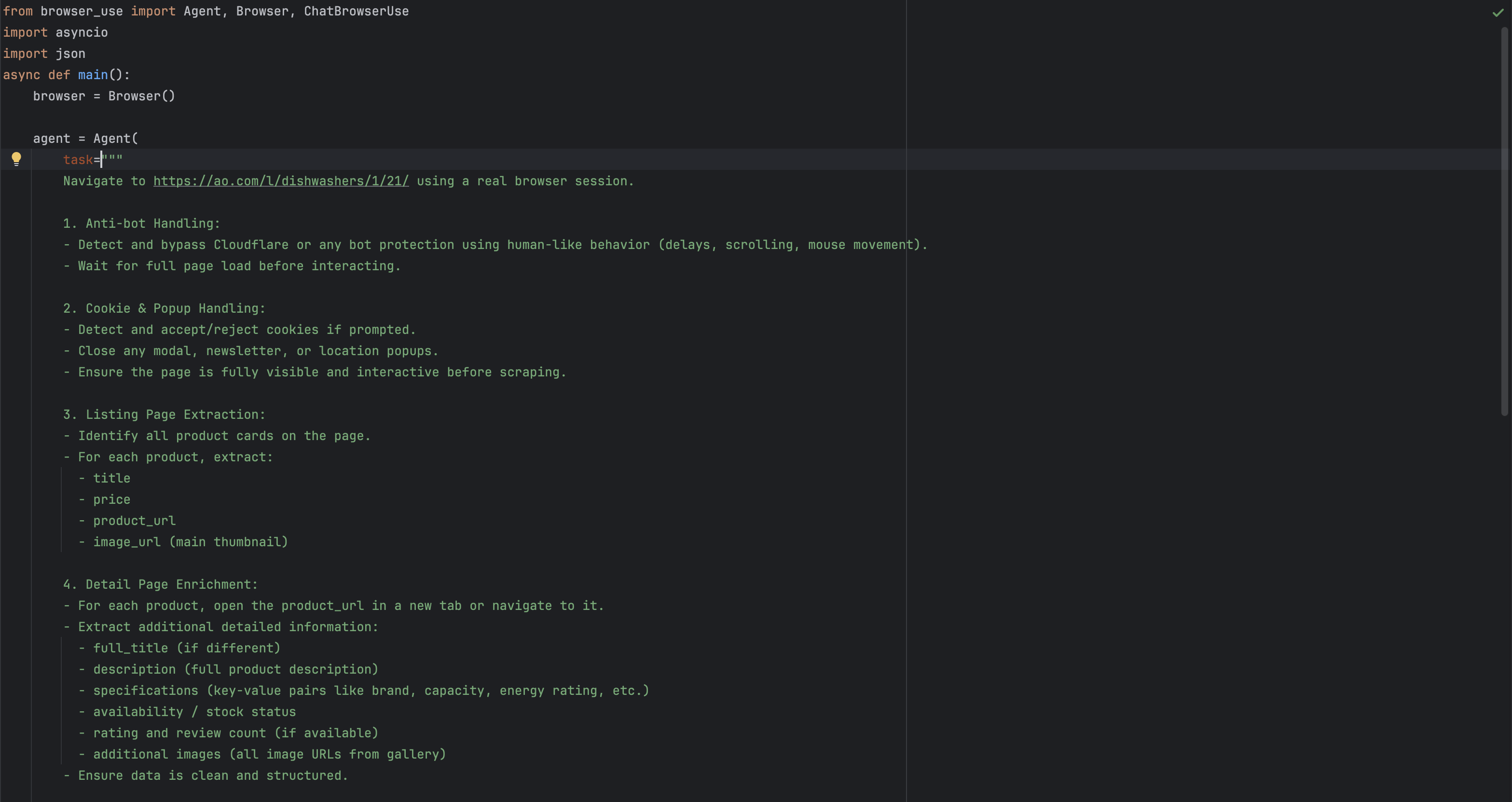 Built an AI-powered web scraping agent using browser_use to extract structured product data from dynamic e-commerce websites.
